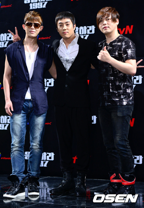 12일 오후 서울 신사동 CGV 청담씨네시티에서 열린 tvN 시추에이션 드라마 '응답하라 1997 (연출 신원호)' 제작발표회에서 토니안, 문희준이 은지원을 응원하기 위해 참석해 포토타임을 갖고 있다.