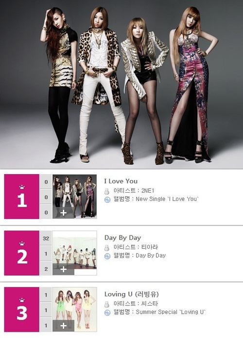 한편 2NE1에 이어 2위에는 티아라의 곡 '데이 바이 데이', 3위에는 지난 주 1위를 차지했던 씨스타의 '러빙유'가 이름을 올렸다.