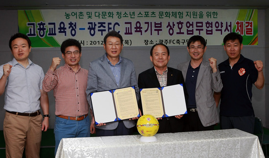 광주는 지난 12일 광주 월드컵경기장 프레스센터 2층 대회의실에서 박병모 광주 단장과 고흥교육지원청 류동운 교육장, 고흥 교육기부 추진단 등 10여명이 참석한 가운데 농어촌 및 다문화청년 스포츠 문화체험을 위한 교육기부 업무협약을 체결했다.