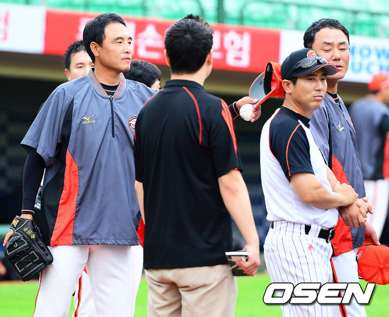 13일 오후 사직구장에서 '2012 팔도 프로야구' 롯데 자이언츠와 한화 이글스 경기가 열릴 예정인 가운데 양팀 훈련 시간에 한화 송진우 코치가 롯데 박정태 코치의 머리를 장난으로 치고 있다.