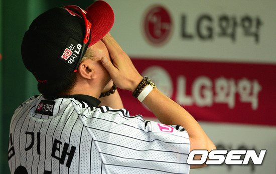 13일 오후 서울 잠실구장에서 열린 '2012 팔도 프로야구' LG 트윈스와 넥센 히어로즈의 경기, 1회 공수교대에 LG 김기태 감독이 안약을 넣고 얼굴을 만지고 있다.