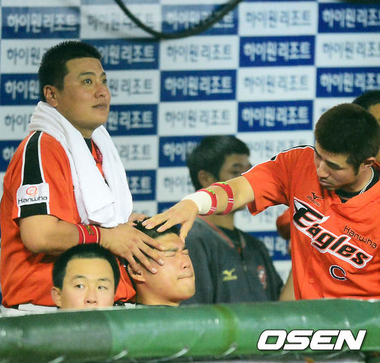 13일 오후 사직구장에서 열린 '2012 팔도 프로야구' 롯데 자이언츠와 한화 이글스 경기에서 5회말을 마치고 우천으로 인해 경기가 잠시 중단된 상황에서 덕아웃에서 한화 김태균이 최진행에게 머리안마를 시켜주고 있다.