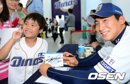 14일 오후 창원 마산야구장에서 열리는 '2012 팔도 프로야구 창원 퓨처스 올스타전' 경기 시작전 나성범이 팬사인회에서 한 어린이 팬과 기념촬영을 하고 있다.