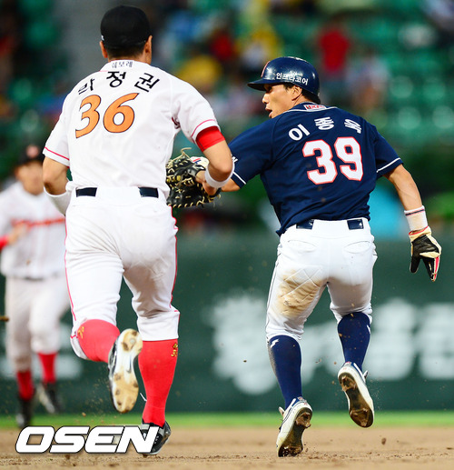 14일 오후 인천 문학구장에서서 열린 '2012 팔도 프로야구' SK 와이번스와 두산 베어스의 경기에서 6회초 1사 주자 1,3루 두산 윤석민의 2루수 앞 병살타때 이종욱이 협살을 당하고 있다.