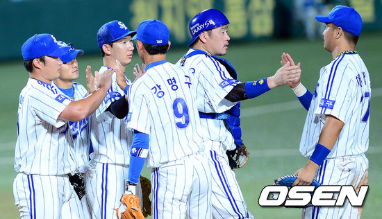 15일 오후 대구구장에서 열린 '2012 팔도 프로야구' 삼성 라이온즈와 KIA 타이거즈의 경기 종료 후 삼성 선수들이 하이파이브를 하고 있다.