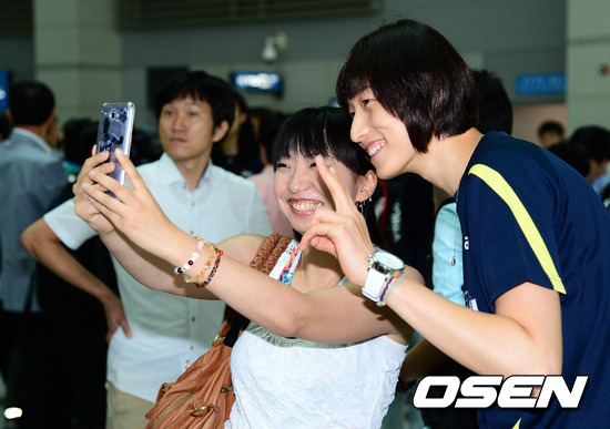 한국 여자배구대표팀 김연경이 지인과 기념촬영을 하고 있다.