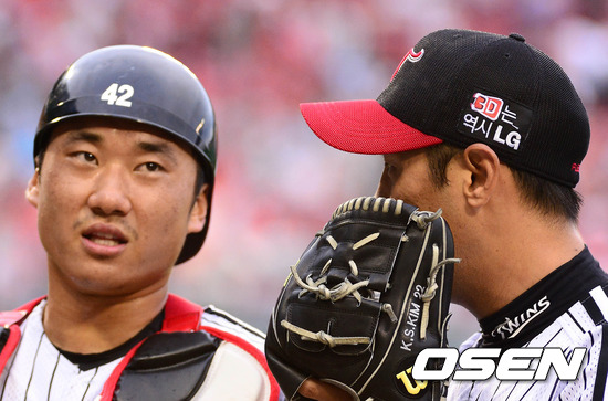 17일 오후 서울 잠실야구장에서 열린 '2012 팔도 프로야구' LG 트윈스와 SK 와이번스의 경기, 2회초 2사 SK 김강민을 내야땅볼로 처리한 LG 김광삼이 포수 김태군과 이야기를 나누고 있다.