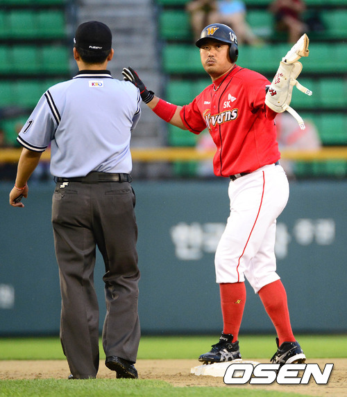 17일 오후 서울 잠실야구장에서 열린 '2012 팔도 프로야구' LG 트윈스와 SK 와이번스의 경기, 4회초 1사 2루 SK 이호준이 좌전 선제 적시타를 치고 타임을 외치고 있다.