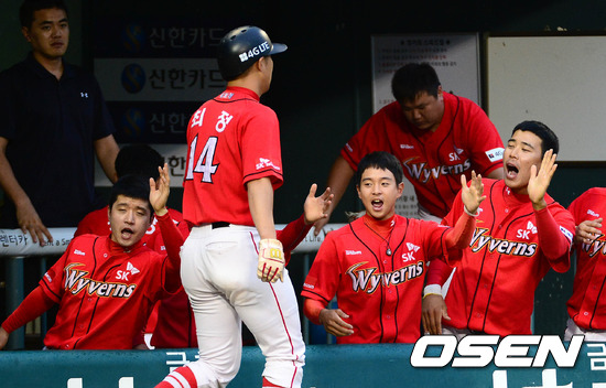 17일 오후 서울 잠실야구장에서 열린 '2012 팔도 프로야구' LG 트윈스와 SK 와이번스의 경기, 4회초 1사 2루 SK 이호준의 좌전 선제 적시타때 홈을 밟은 2루주자 최정이 더그아웃에서 동료들과 하이파이브를 하고 있다.