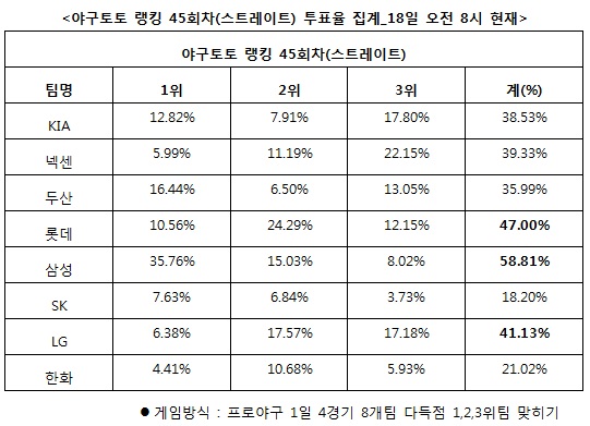 국민체육진흥공단(www.kspo.or.kr)이 발행하는 체육진흥투표권 수탁사업자인 스포츠토토 공식 온라인 발매 사이트인 베트맨(www.betman.co.kr)이 19일 오후 6시 30분에 열리는 2012 프로야구 4경기 8개팀을 대상으로 한 야구토토 랭킹 45회차 스트레이트 게임을 중간집계한 결과, 참가자들은 삼성(58.81%), 롯데(47.00%), LG(41.13%) 순으로 다득점 상위 3개팀을 꼽았다. 반면 한화(21.02%)와 SK(18.20%)는 가장 적은 득점을 기록할 것으로 예상됐다.