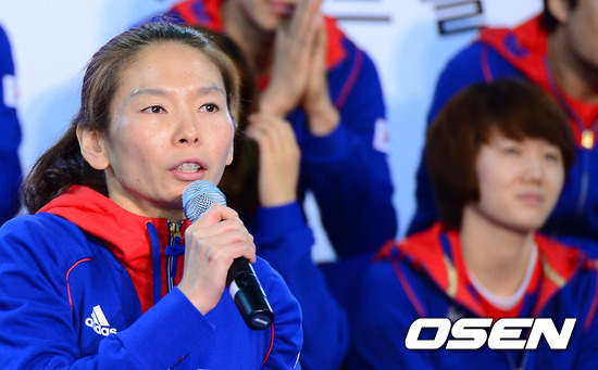 여자대표팀 우선희가 질문에 답을 하고 있다.