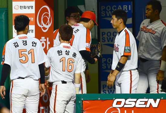 18일 오후 대전 한밭구장에서 열린 2012 팔도 프로야구 한화 이글스와 삼성 라이온즈의 경기 3회초 삼성 조동찬에게 솔로홈런을 허용한 한화 선발투수 류현진이 강판되고 있다