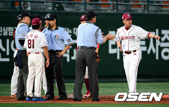 18일 오후 서울 목동야구장에서 열린 '2012 팔도 프로야구' 넥센 히어로즈와 롯데 자이언츠의 경기, 3회초 1사 2루 롯데 홍성흔의 내야땅볼때 2루주자 김주찬이 세이프되자 김시진 감독이 라인을 벗어난 것이 아니냐며 심판진에 어필하고 있다.