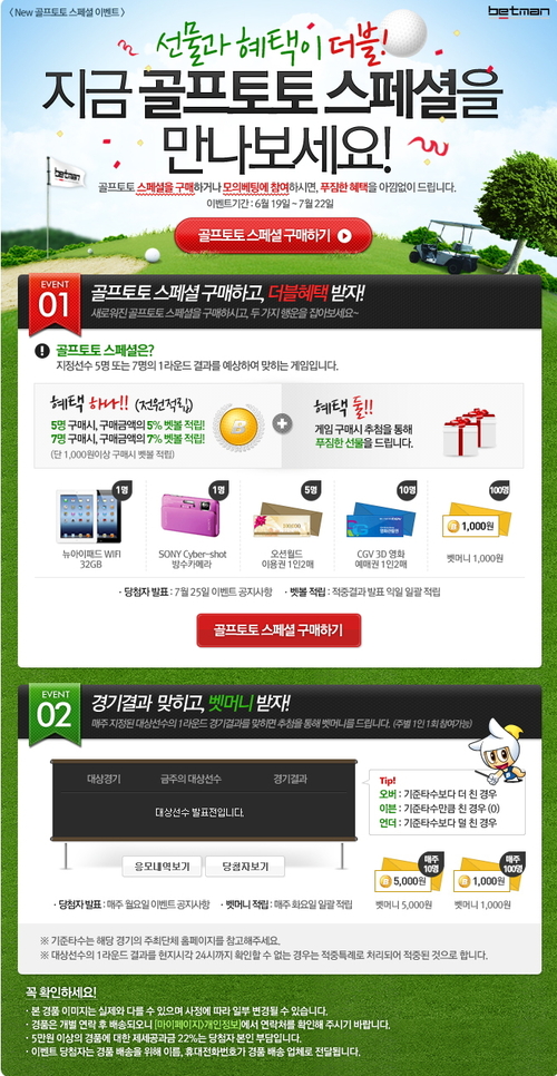 이벤트 1 '골프토토 스페셜 구매하고, 더블혜택 받자!'에 참가하고자 하는 회원들은 골프토토 스페셜 게임을 구매한 후 응모하면 된다. 참가자 중 추첨을 통해 뉴아이패드32GB(1명), SONY 방수카메라(1명), 오션월드 이용권(1인 2매/5명), CGV 3D 영화예매권(1인2매/10명), 벳머니 1,000원 (100명) 등 푸짐하고 다양한 경품을 증정하게 된다.