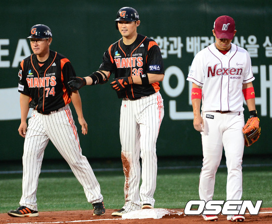 19일 오후 서울 목동야구장에서 열린 '2012 팔도 프로야구' 넥센 히어로즈와 롯데 자이언츠의 경기, 3회초 2사 1루 롯데 박종윤이 우중간 적시타를 치고 타임을 외치고 있다.
