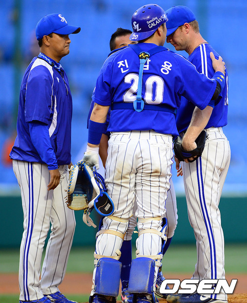 19일 오후 대전 한밭구장에서 열린 2012 팔도 프로야구 한화 이글스와 삼성 라이온즈의 경기 2회말 2사 1,2루 삼성 선발투수 고든이 강판되고 있다. 고든은 이날 1⅔이닝 5실점했다.