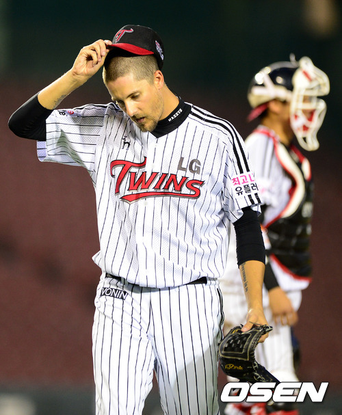 19일 오후 서울 잠실구장에서 열린 '2012 팔도 프로야구' LG 트윈스와 SK 와이번스의 경기, 5회초 1사 만루에서LG 주키치가 SK 최정에 역전 적시타를 허용하고 강판당하고 있다.