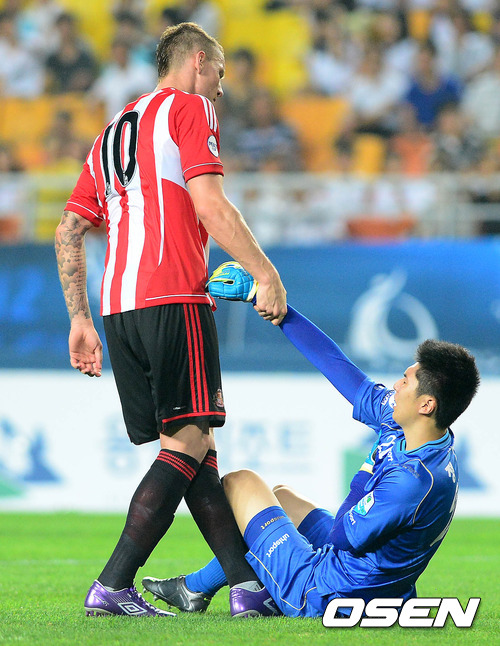 19일 오후 수원월드컵경기장에서 열린 '2012 피스컵 수원' 개막전 성남 일화와 선덜랜드의 경기 후반 정산 골키퍼가 누워있자 코너 위컴이 일으키고 있다.