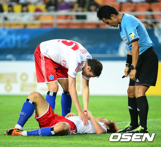20일 오후 수원월드컵경기장에서 열린 '2012 피스컵 수원' 2차전 함부르크 SV와 FC 흐로닝언의 경기, 전반 흐로닝언의 문전에서 골키퍼 비조와 충돌한 함부르크 손흥민이 고통스러워하고 있다.