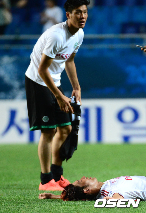 경기 종료 후 흐로닝언의 석현준이 누워있는 함부르크의 손흥민을 바라보고 있다. / sunday@osen.co.kr