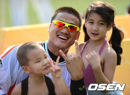 21일 오후 대전 한밭야구장에서 열리는 '2012 팔도 프로야구 올스타전' 경기 전 홍성흔이 경기장을 찾은 아들 딸과 기념촬영을 하고 있다.