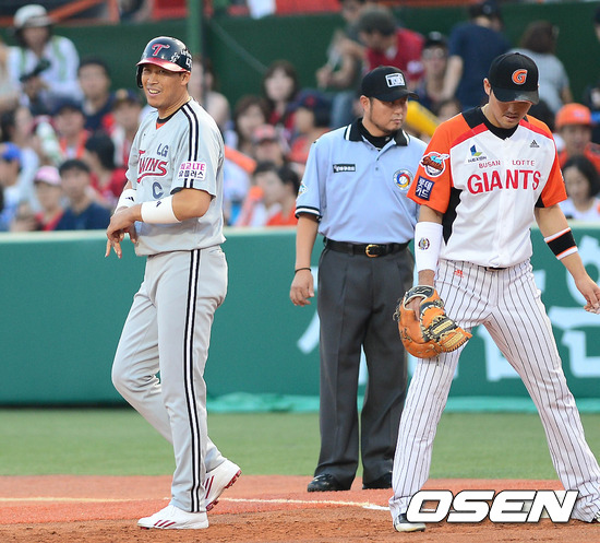 21일 오후 대전 한밭야구장에서 열린 '2012 팔도 프로야구 올스타전' 경기 2회초 1사 이병규가 1루타를 치고 미소를 짓고 있다.