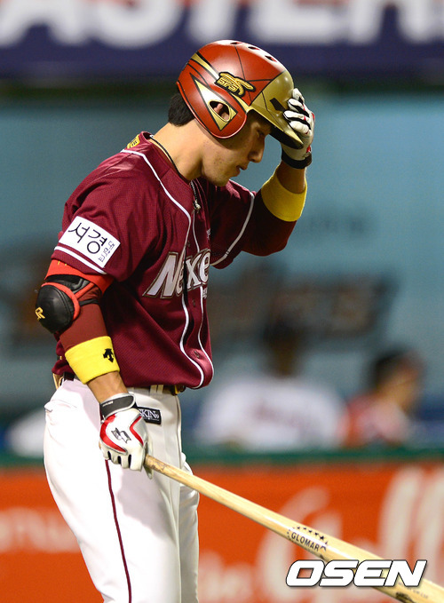 21일 오후 대전 한밭야구장에서 열리는 '2012 팔도 프로야구 올스타전' 경기, 7회초 넥센 서건창이 마스코트 턱돌이에게서 받은 헬멧을 쓰고 타석에 들어서고 있다.
