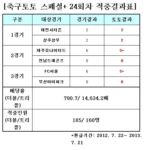 한편, 이어지는 축구토토 스페셜+ 25회차는 25일에 벌어지는 K-리그 성남-전북(1경기)전, 경남-제주(2경기)전, 부산-울산(3경기)전을 대상으로 시행되며, 경기시작 10분전인 오후 7시 20분까지 게임에 참여할 수 있다.