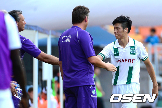 22일 오후 수원월드컵경기장에서 열린 '2012 피스컵 수원' 3,4위전 선덜랜드 AFC와 FC 흐로닝언의 경기, 후반 흐로닝언 석현준이 교체아웃되며 마스칸트 감독과 악수를 나누고 있다.