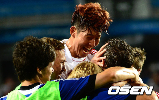22일 오후 수원월드컵경기장에서 열린 '2012 피스컵 수원' 결승전 성남일화 AFC와 함부르크 SV의 경기, 후반 함부르크 손흥민이 선제골을 성공시킨 베리를 축하하고 있다.