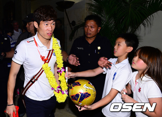 23일 새벽(이하 한국시간) 인도네시아 수라바야의 부미 수라바야 호텔에 도착한 퀸즈 파크 레인저스 FC (QPR)의 박지성이 호텔 앞에서 꽃목걸이를 목에 걸고 호텔 안을 통과할때 현지 어린이 팬들이 박지성에게 사인을 원하고 있다.
