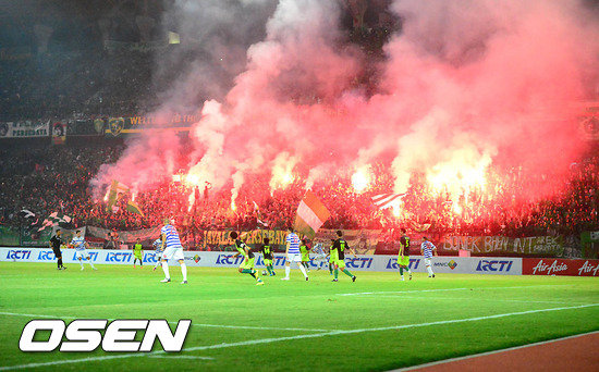 23일 밤(이하 한국시간) 인도네시아 수라바야의 겔오라 분 토모 경기장서 열린 퀸스 파크 레인저스(QPR)와 페르세바야의 '퀸스 파크 레인저스 아시아 투어 2012' 마지막 경기 페르세바야 서포터즈가 열띤 응원을 펼치고 있다.