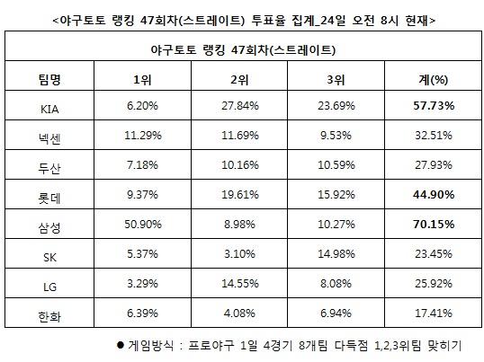 한편, 순위에 상관없이 다득점 3개팀을 맞히는 '박스' 게임에서는 삼성(24.05%), SK(14.07%), KIA(12.25%)가 가장 많은 득점을 기록할 것으로 집계됐다. 다득점 가능성 하위 예상팀으로는 LG(8.38%)와 두산(8.28%)이 꼽혔다.
