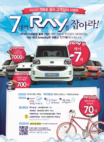 이번 ‘7대의 레이(Ray)를 잡아라!’ 경품 이벤트는 그 동안 이디야커피를 찾아준 소비자들에게 7대의 레이(Ray)를 포함해 하이브리드 자전거(70대), 모바일 음료교환권(700명), 이디야 스틱원두커피(7,000명) 등 총 7,777명에게 다양한 경품을 증정한다.