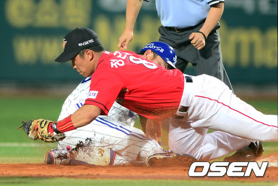 24일 오후 대구야구장에서 열린 '2012 팔도 프로야구' 삼성 라이온즈와 SK 와이번스의 경기, 4회말 1사 2루 우전 역전 적시타를 치고 삼성 진갑용이 오버런을하다 1루로 급히 귀루했지만 SK 정근우에게 태그아웃당하고 있다.