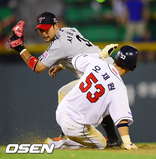 24일 오후 서울 잠실구장에서 열리는 2012 팔도 프로야구 두산 베어스와 LG 트윈스의 경기 7회말 무사 1,3루 두산 김현수의 희생플라이때 1루 주자 오재원이 2루 도루 성공하고 있다. 3루 주자 최주환은 득점.