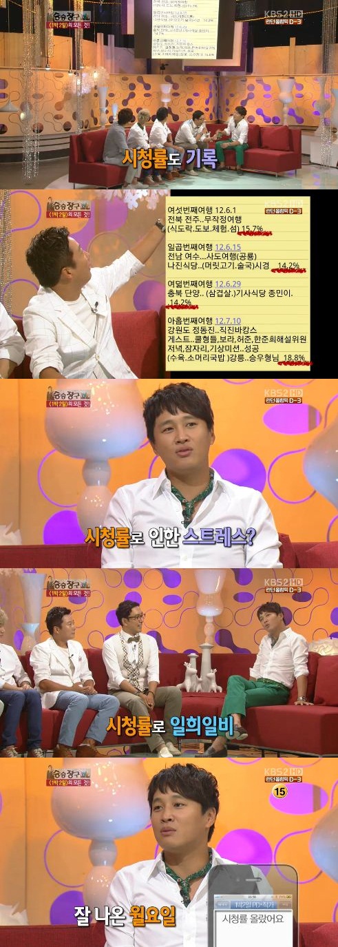 제작진이 시청률이 잘 나오면 문자를 보내고 안 보내면 떨어졌다는 것. 이에 차태현은 "일희일비하지 말고 보내달라고 했다"며 "'1박2일'이 중간에 멤버교체도 있고 어려움이 있었는데 시청률이 조금씩 오는 모습이 우리꺼 같다. 무임승차한 기분이었는데 이제는 그렇지 않다. 우리들끼리는 이게 낫다고 한다"고 솔직하게 말했다.