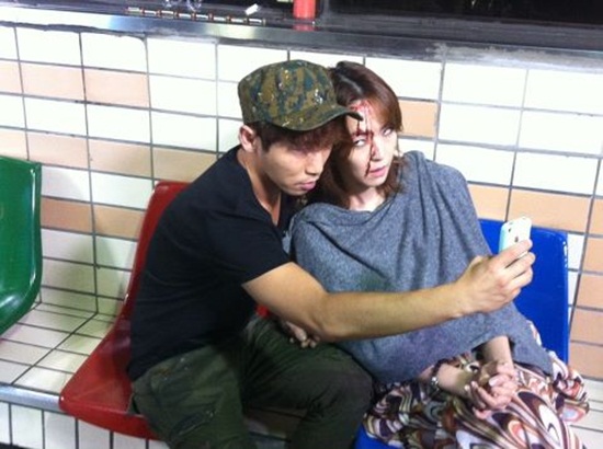 사진 속 김윤아는 머리에 피를 흘리고 있는 귀신 분장을 한 채 눈을 위로 치켜뜨는 엽기적인 표정으로 눈길을 끈다. 그의 옆에 앉아 있는 유세윤은 김윤아와 똑같은 표정을 지으며 셀카 촬영에 여념이 없는 모습이다.