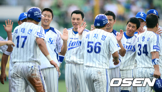 25일 오후 대구야구장에서 열린 '2012 팔도 프로야구' 삼성 라이온즈와 SK 와이번스의 경기, 1회말 2사 만루 삼성 조동찬의 우전 3타점 적시 3루타때 홈을 밟은 채태인, 이지영, 최형우가 더그아웃에서 동료들과 하이파이브를 하고 있다.