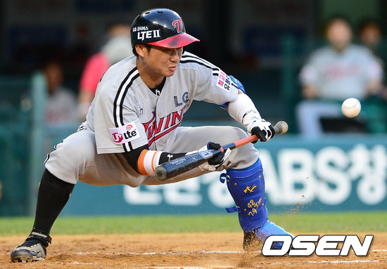 25일 오후 서울 잠실구장에서 열린 '2012 팔도 프로야구' 두산 베어스와 LG 트윈스의 경기 5회초 무사 1루 김태군이 희생번트를 하고 있다.