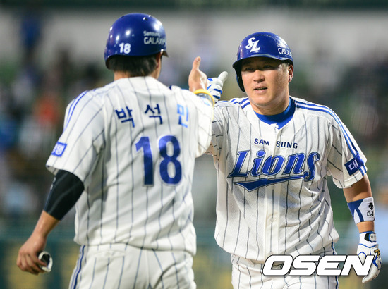 25일 오후 대구야구장에서 열린 '2012 팔도 프로야구' 삼성 라이온즈와 SK 와이번스의 경기, 3회말 1사 1루 삼성 최형우가 우월 투런홈런을 치고 홈을 밟은 1루주자 박석민의 축하를 받고 있다.
