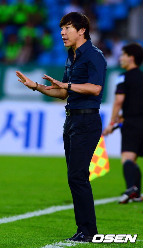 25일 오후 성남 탄천종합운동장에서 열린 '현대오일뱅크 K리그 2012' 성남 일화와 전북 현대의 경기 전반 성남 신태용 감독이 선수들을 격려하고 있다.