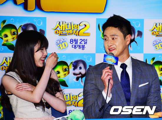 26일 오후 서울 용산 CGV에서 열린 '새미의 어드벤쳐 2' 언론 배급 시사회에서 김원효의 말에 아이유가 환하게 웃고 있다.