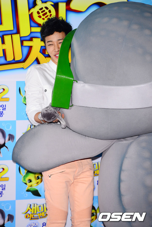 26일 오후 서울 용산 CGV에서 열린 '새미의 어드벤쳐 2' 언론 배급 시사회에서 이기광이 자신의 캐릭터 인형 '리키'에게 키스를 당하고 있다.