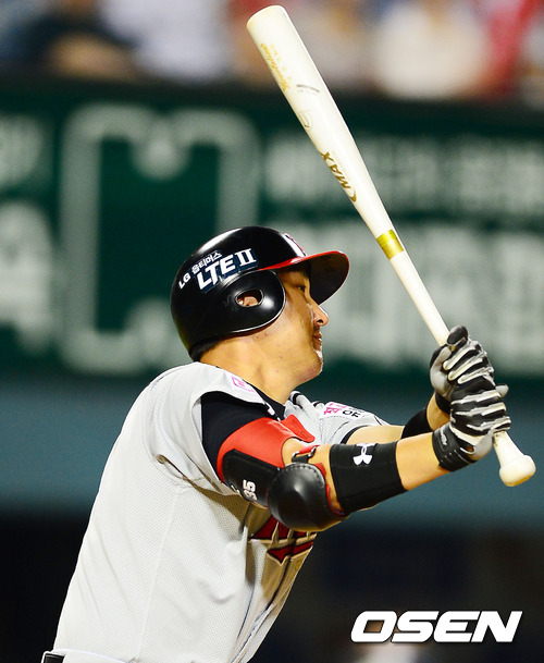 26일 오후 서울 잠실구장에서 열린 '2012 팔도 프로야구' 두산 베어스와 LG 트윈스의 경기에서 6회초 2사 주자 2루 LG 이진영의 중견수 앞 1타점 적시타를 날리고 있다.