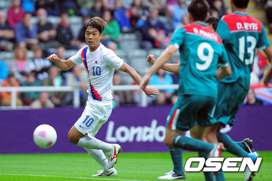 [OSEN=뉴캐슬(영국), 올림픽공동취재단] 26일 밤(한국시간) 영국 뉴캐슬 세인트 제임스 파크에서 열린 '2012 런던올림픽' 축구 조별리그 B조 1차전 대한민국과 멕시코의 경기 전반 박주영이 문전 돌파를 시도하고 있다.