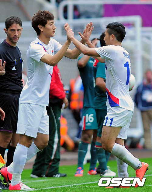 [OSEN=뉴캐슬(영국), 올림픽공동취재단] 26일 밤(한국시간) 영국 뉴캐슬 세인트 제임스 파크에서 열린 '2012 런던올림픽' 축구 조별리그 B조 1차전 대한민국과 멕시코의 경기 후반 남태희와 지동원이 교체되고 있다.