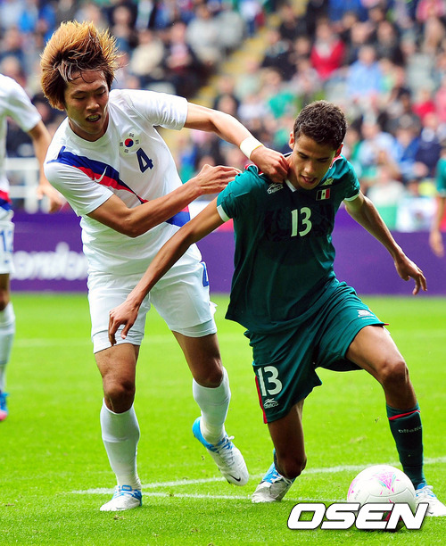[OSEN=뉴캐슬(영국), 올림픽공동취재단] 26일 밤(한국시간) 영국 뉴캐슬 세인트 제임스 파크에서 열린 '2012 런던올림픽' 축구 조별리그 B조 1차전 대한민국과 멕시코의 경기 후반 김영권이 볼다툼을 하고 있다.