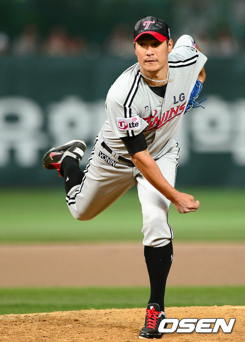 27일 오후 인천 문학야구장에서 열린 '2012 팔도 프로야구' LG 트윈스와 SK 와이번스의 경기, 6회말 LG 주키치와 교체된 이동현이 힘차게 공을 던지고 있다.