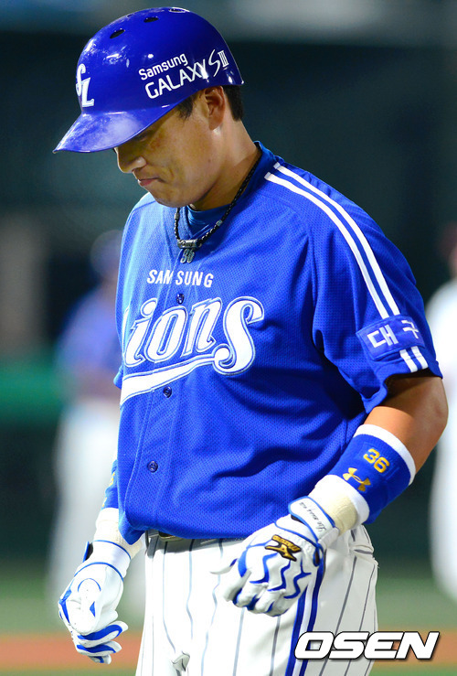 27일 서울 목동구장에 열린 '2012 팔도 프로야구' 넥센 히어로즈와 삼성 라이온즈의 경기, 8회초 2사 1,2루 삼성 이승엽이 중견수 플라이 아웃으로 이닝이 끝나자 아쉬운 표정을 지으며 덕아웃으로 들어가고 있다.